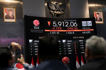 JAKARTA (Reuters) -Indonesia’s stock market sank and the rupiah fell to a record low on Tuesday as markets reopened after an extended holiday break and reacted to global market turmoil caused by U.S.