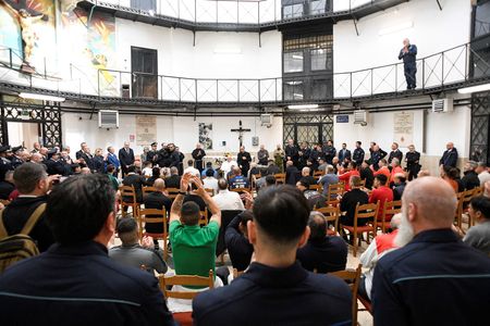 Francis stayed at the prison for about half an hour. The Vatican said he met with a group of about 70 inmates.