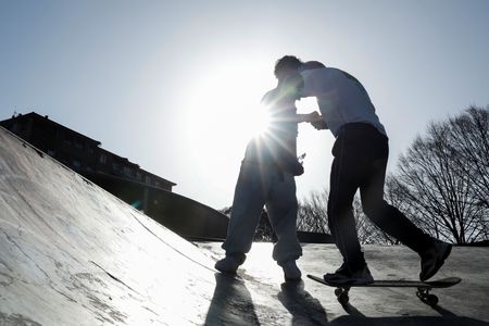 Other skaters, dressed in baggy streetwear, crane their necks while the sun casts long shadows over the graffiti-covered concrete.