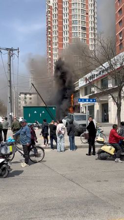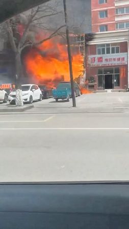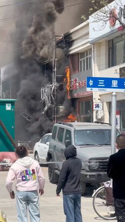 Footage circulating on social media including X and Chinese platform Douyin, and verified by Reuters, showed bright orange flames engulfing a storefront on street level alongside scores of parked vehicles.