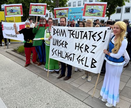 About 200 Commerzbank employees gathered outside the venue of the annual shareholder meeting, carrying placards saying “strong and standalone” and “no to UniCredit”.