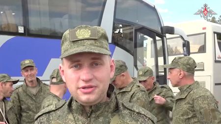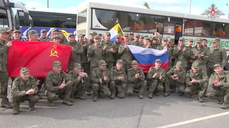 Another video showed released soldiers wearing military fatigues holding up a Russian and a Soviet flag and shouting “Hurrah!”