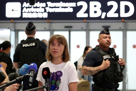 PARIS (Reuters) -Greta Thunberg on Tuesday accused Israel of kidnapping her and her fellow pro-Palestinian activists in international waters, saying she declined to sign a document stating she entered the country illegally prior to being deported.
