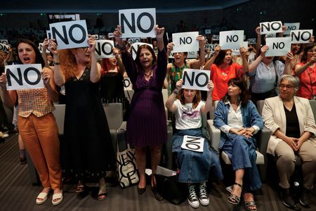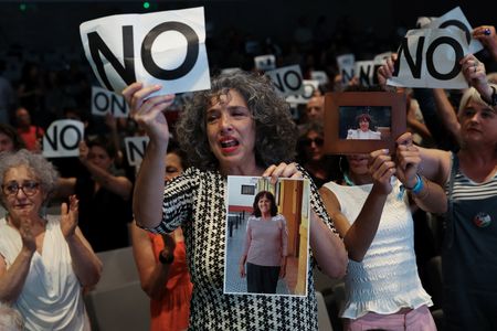 Protesters – including survivors in their 60s and 70s, activists and relatives – held up banners marked “No” during the event on Monday night, threw the signs into the audience and forced organisers to suspend the meeting.