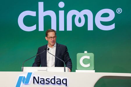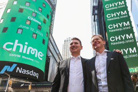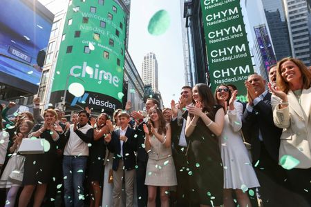 (Reuters) -Chime Financial’s shares surged 59% in their hotly anticipated Nasdaq debut on Thursday, valuing the digital bank at $18.4 billion and extending a winning streak for new stock market listings.
