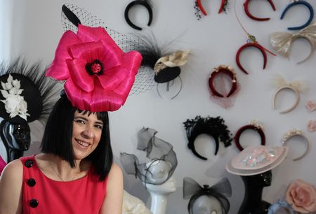 LONDON (Reuters) -At her London studio, Merve Bayindir carefully glues on dried flowers onto a pale pink saucer hat. Nearby, an array of other colourful headpieces are on display.