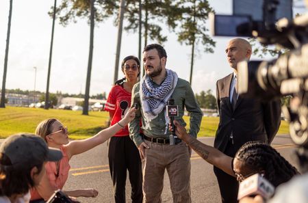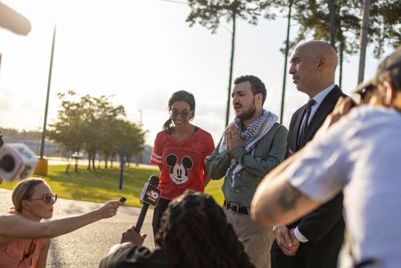 “Free Palestine!” Khalil said with a raised fist as he left the airport.