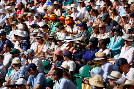 LONDON (Reuters) -Wimbledon experienced its hottest-ever start on a scorching Monday as temperatures climbed to 32.3 degrees Celsius and transformed the All England Club into a sizzling spectacle of sun hats, shade-seekers and fans reaching for water bottles.