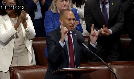 WASHINGTON (Reuters) -Hakeem Jeffries talked. And talked. And talked, as the top Democrat in the House of Representatives on Thursday blasted President Donald Trump’s sweeping tax cut and spending bill in the longest speech in the chamber’s history.