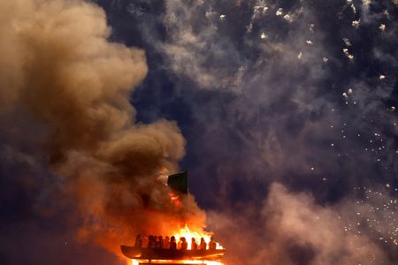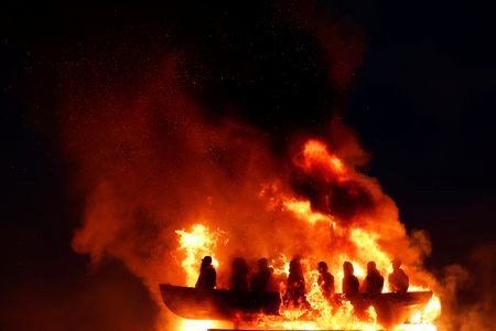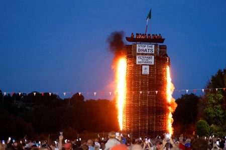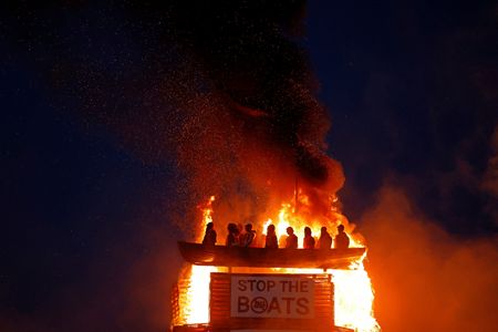 MOYGASHEL, Northern Ireland (Reuters) -A model of refugees in a boat, placed on a bonfire in a pro-British town near Belfast, was set alight on Thursday night, weeks after migrants’ homes were attacked nearby.