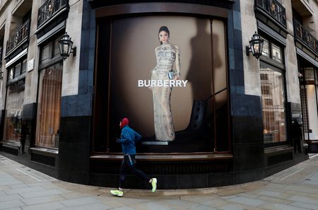 LONDON (Reuters) -Burberry’s sales fell by a less-than-expected 1% in the first quarter, as it benefited in the Americas and Europe from clearer brand positioning leaning on its British heritage, the luxury group said on Friday.