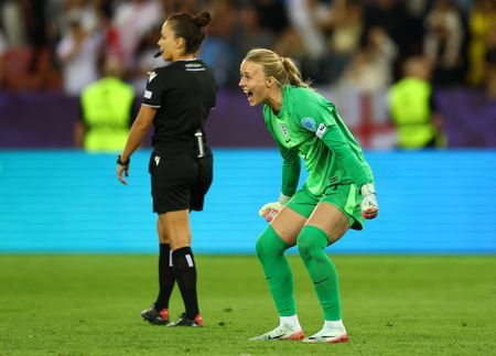 ZURICH (Reuters) -As a bloodied Hannah Hampton saved two penalties to send England into the Euro 2025 semi-finals, it was all the more impressive given she was advised at a young age against pursuing football because of an eye condition that affects her depth perception.
