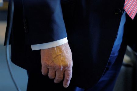 WASHINGTON (Reuters) -The White House said on Thursday that U.S. President Donald Trump is experiencing swelling in his lower legs and bruising on his right hand, after photographs emerged of Trump with swollen ankles and makeup covering the afflicted part of his hand.