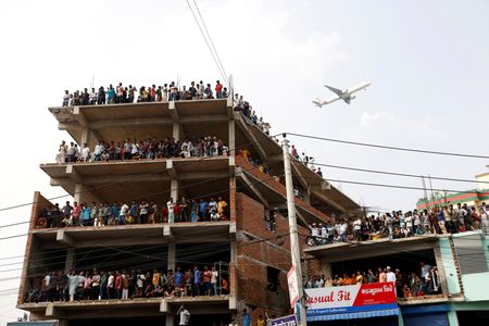 DHAKA (Reuters) -At least 19 people were killed and 164 injured as a Bangladesh air force training jet crashed into a college and school campus in the capital Dhaka on Monday after experiencing a technical problem shortly after take-off, a military spokesperson said.