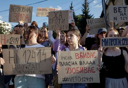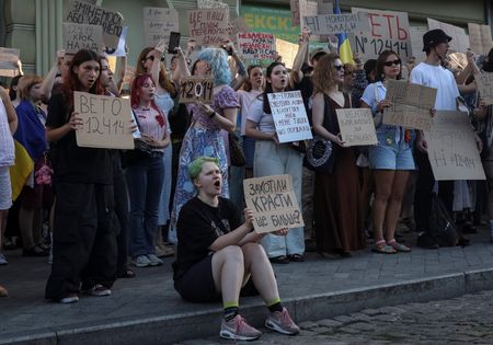 Hundreds of protesters, some clad in military uniforms, in the city of Zaporizhzhia, close to the frontline in the southeast, demanded overturning the law with chants of “Ukraine is not Russia.” Similar rallies took place in other major cities across the country.