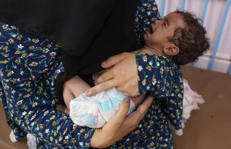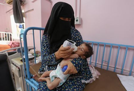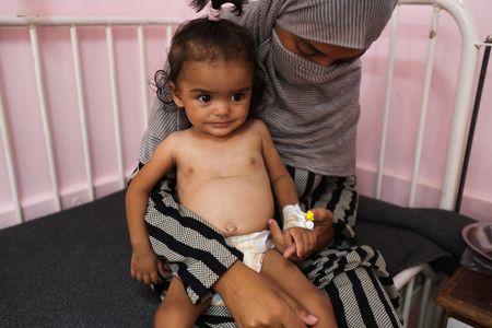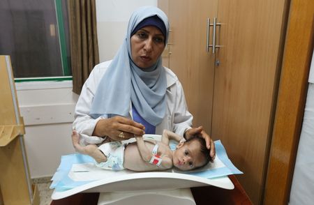 KHAN YOUNIS, Gaza Strip (Reuters) -On the pink walls of Nasser hospital’s child malnutrition ward, cartoon drawings show children running, smiling, and playing with flowers and balloons.