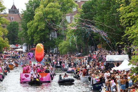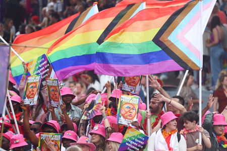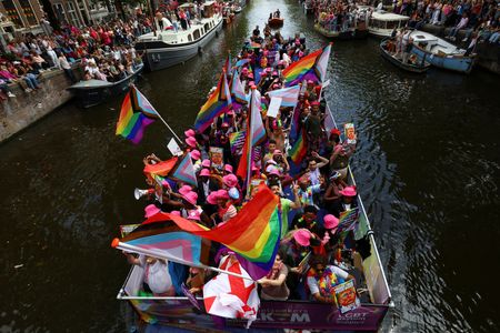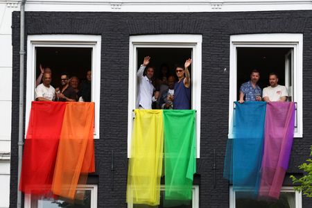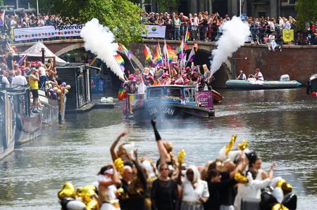 AMSTERDAM (Reuters) -Around 80 colorful pride boats sailed through Amsterdam’s World Heritage canals on Saturday in the finale of a week-long celebration in the city that stood in stark contrast to recent crackdowns on LGBTQ+ rights in fellow EU member state Hungary.
