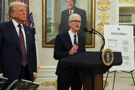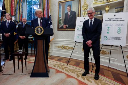 WASHINGTON (Reuters) -President Donald Trump announced on Wednesday that Apple will invest an additional $100 billion in the United States, a move that could help it sidestep potential tariffs on iPhones.