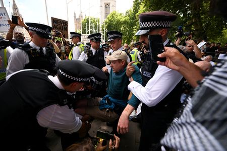 The Reuters video showed demonstrators who had gathered in Parliament Square by the Houses of Parliament being carried away by police.