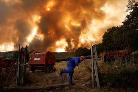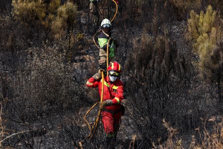 VILLANUEVA DE LA SIERRA, Spain (Reuters) -Spain battled 14 major fires driven by high winds and aggravated by heat on Friday as authorities warned of “unfavourable conditions” to tackle flames that have already killed seven people and burned an area the size of London.