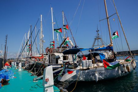 MADRID (Reuters) -A flotilla of dozens of boats loaded with aid for Gaza departed Barcelona port on Monday evening after stormy weather forced them to return to port earlier, Reuters footage showed.