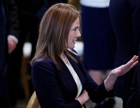 NEW YORK (Reuters) -Conservative Supreme Court Justice Amy Coney Barrett rejected on Thursday the notion of a U.S. constitutional crisis as President Donald Trump’s far-reaching executive actions test legal boundaries and spark tension with the judiciary.
