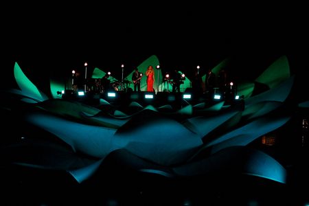 For half an hour on Wednesday, the singer, decked out in a shimmering red dress, performed her hits on a floating stage shaped like an enormous water lily on the Guama River, while fans watched the concert from a different site.