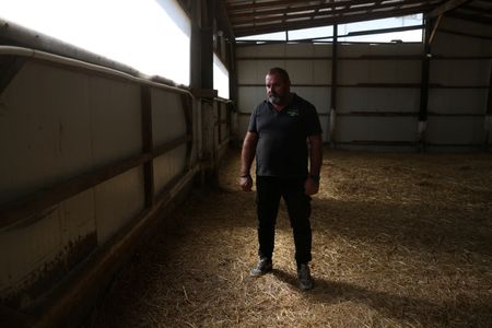 Giorgos Tasioulis, fighting back tears, stands in front of his empty sheep sheds.