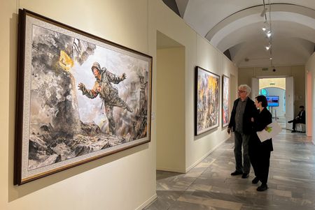 The exhibition showcases more than 100 paintings and other pieces of art, many of which are reminiscent of Soviet socialist realism.