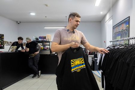 He opened his Zaboy store on a pleasant, tree-lined street in June. Barely flinching at the explosions, soldiers and civilians browse the racks of T-shirts and sweat tops, or buy a coffee at the bar.
