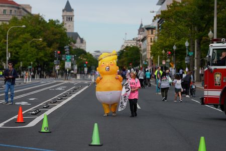By all accounts, the demonstrations were largely festive, often featuring inflatable characters and marchers dressed in costumes.