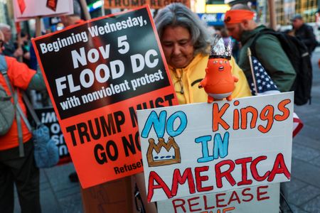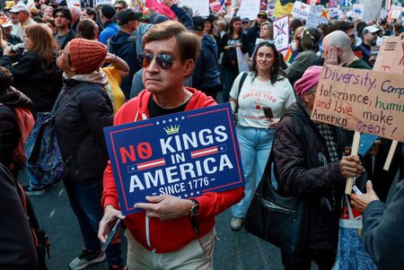 (Reuters) – Protesters spanning all age groups took to the streets en masse for “No Kings” rallies across the United States on Saturday, denouncing what they view as authoritarian tendencies and unbridled corruption of U.S.