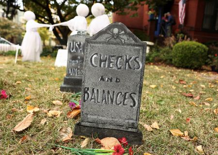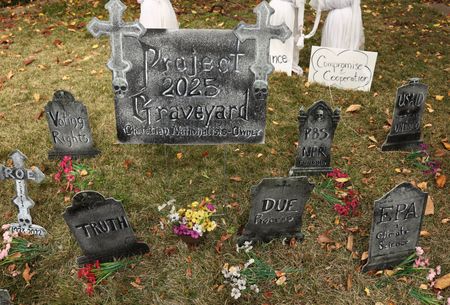 In a front yard close to the U.S. Capitol, Donna Breslin, 79, has installed an entire graveyard with 16 headstones to mark policy moves Trump has made since he took office in January that she says are killing off American democracy.