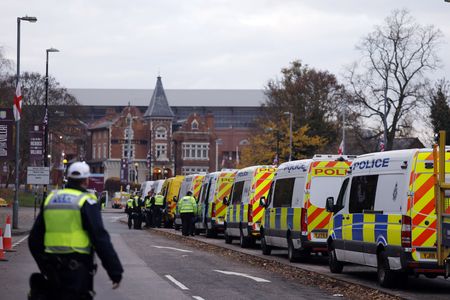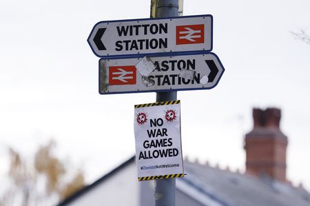 BIRMINGHAM, England (Reuters) -Pro-Palestinian and pro-Israeli supporters demonstrated outside the politically-charged Europa League soccer match between Aston Villa and Israeli club Maccabi Tel Aviv on Thursday and police made 11 arrests, but the game was played without major disruptions.
