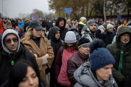 BELGRADE (Reuters) -Thousands of anti-government protesters, led by students, marched peacefully through the Serbian capital Belgrade on Saturday, demanding accountability for those responsible for the deaths of 16 people when a railway station roof collapsed and an attack on a student protest a year ago.