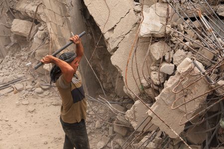 Carrying heavy buckets of rubble and pushing a wheelbarrow, Suleiman al-Arja, 19, described a typical day in the quest for iron rods.