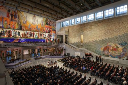 The audience cheered and clapped when Norwegian Nobel Committee head Joergen Watne Frydnes said during his speech that Machado would be coming to Oslo.