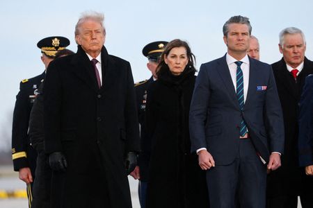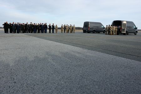 Standing at the foot of an Air Force transport plane on a cold and blustery day, Trump, Hegseth and others saluted as one by one the caskets were carried off by white-gloved soldiers and loaded onto a waiting vehicle.