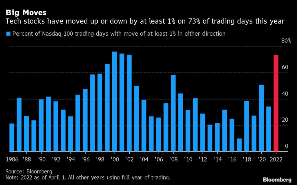 Tech investors have been treated to a wild ride over the first three-plus months of the year. The Nasdaq 100 Index has closed higher or lower by at least 1% on 73% of trading days in 2022, which would be the highest percentage in two decades if the trend were to continue for the remainder of the year.