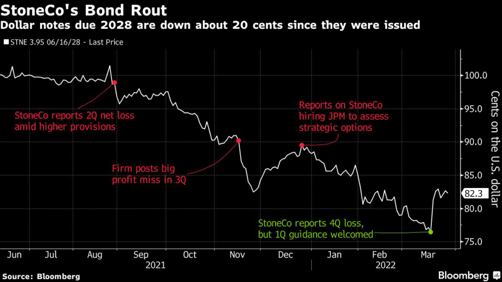 The poor bond performance also reflects some of StoneCo’s own challenges — it halted lending to small and middle-sized companies in October after a bad experience and its adjusted net income fell 79% in 2021. Meanwhile, its main competitor Cielo SA, owned by Bradesco and Banco do Brasil SA, reported a 98% increase in net income.